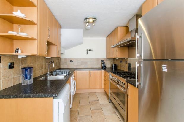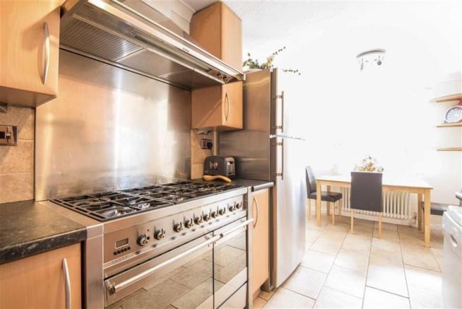 Fully fitted kitchen with integrated appliances and dining area